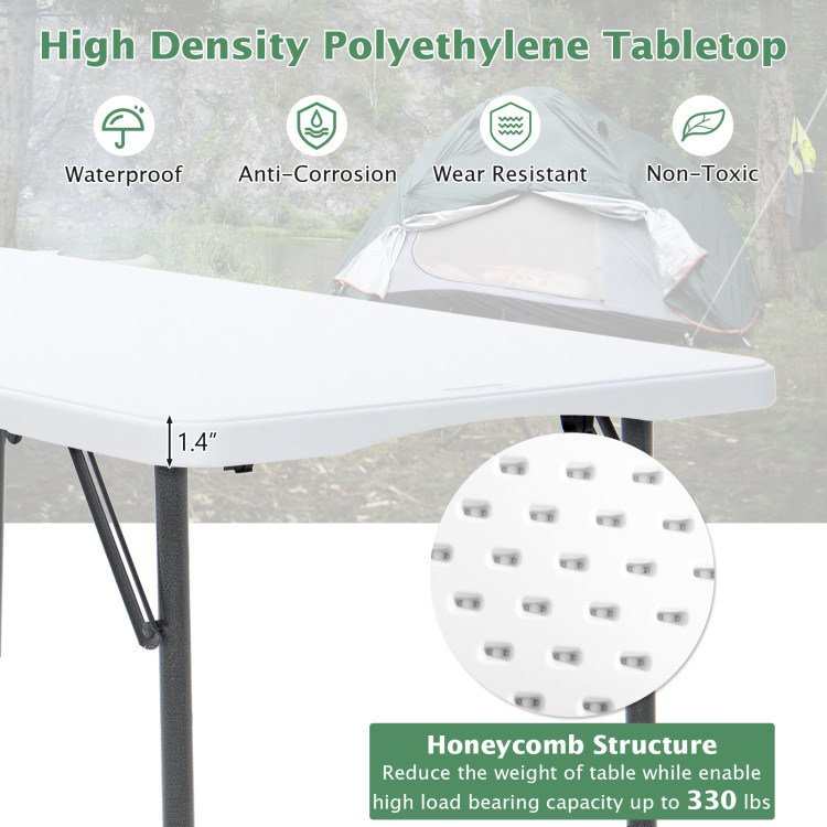 5.Convenient to Use and Maintain: Coming with an illustrated instruction, the folding table is easy to set up, adjust height and fold up in seconds. It doesn't require any difficult assembly process at all. In addition, the stain-resistant and waterproof HDPE tabletop makes cleaning a breeze.