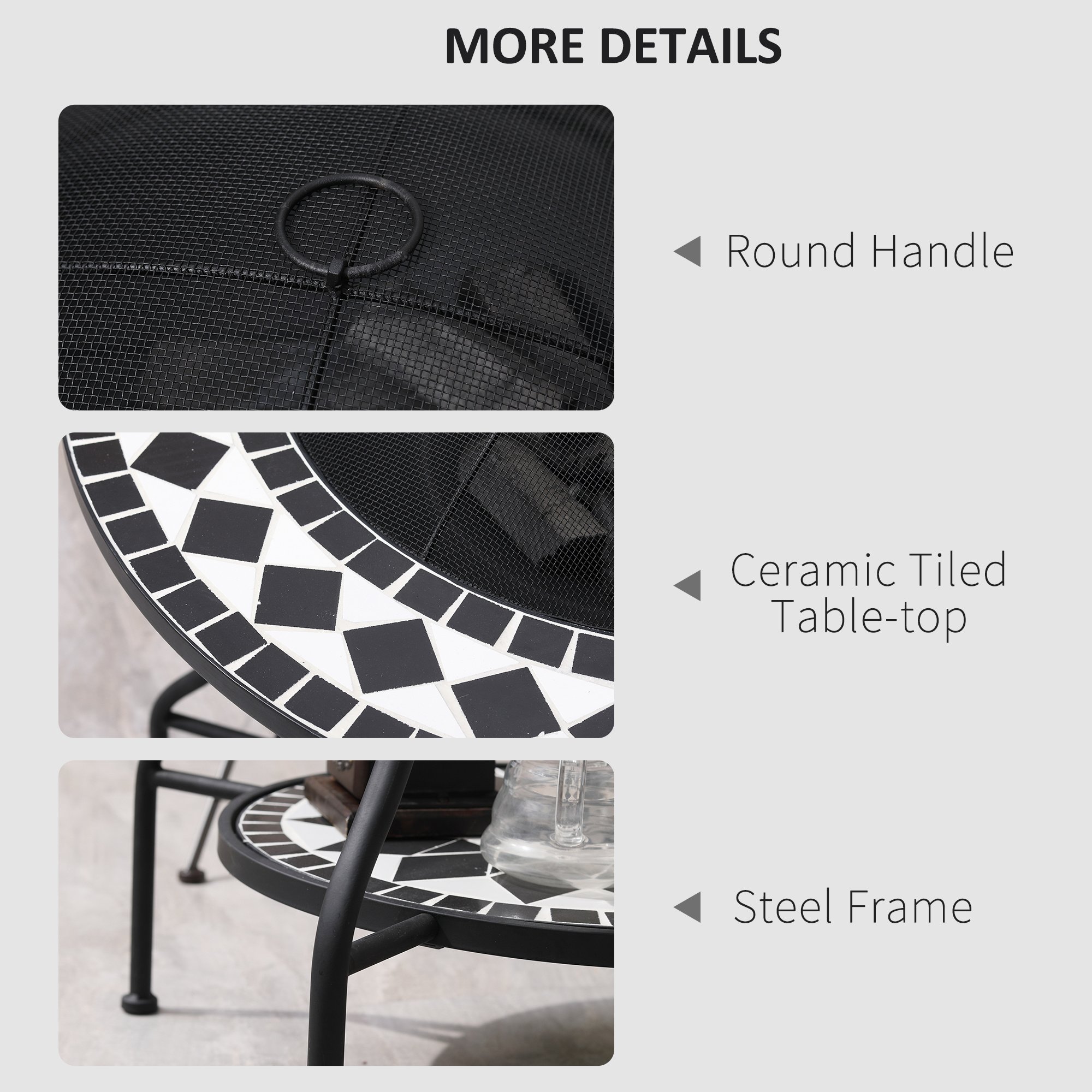 Impressive Table: The ceramic top of our outdoor fire pit dining table is a sure centerpiece. Its wood-burning bowl brings a warm bright ambiance to bonfires and backyard barbeques. Convenient day or night, it can keep you cool or light your night.