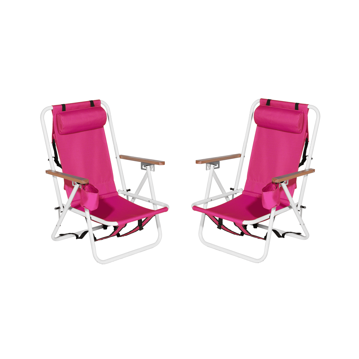 Home > Folding Beach Chair Set of 2 for Adults, 4 Position Portable Backpack Foldable Camping Chair with Headrest Cup Holder and Wooden Armrests, Pink