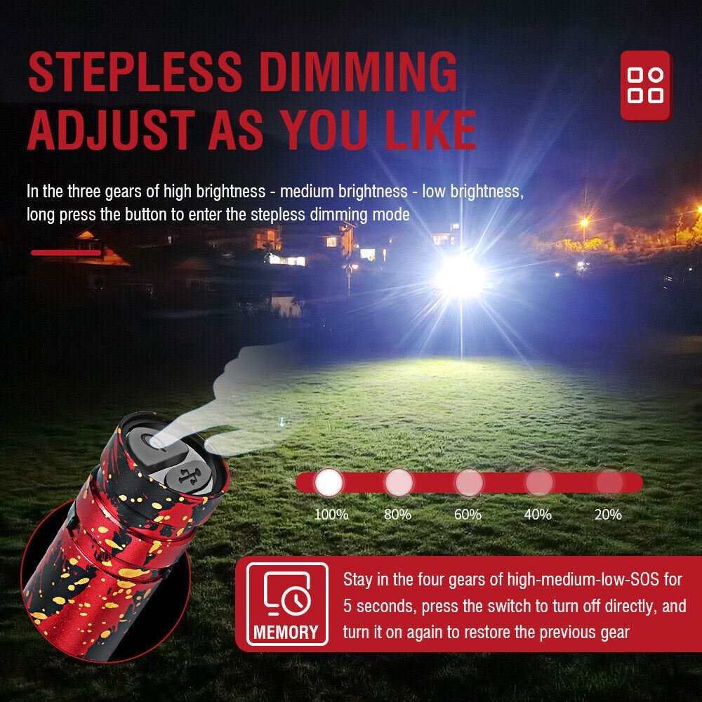 Luminous gear: 5 gears: high 1 hour 45 minutes, medium 2 hours 30 minutes, SOS 5 hours 10 minutes, flash 4 hours 30 minutes (double click)