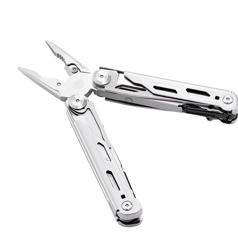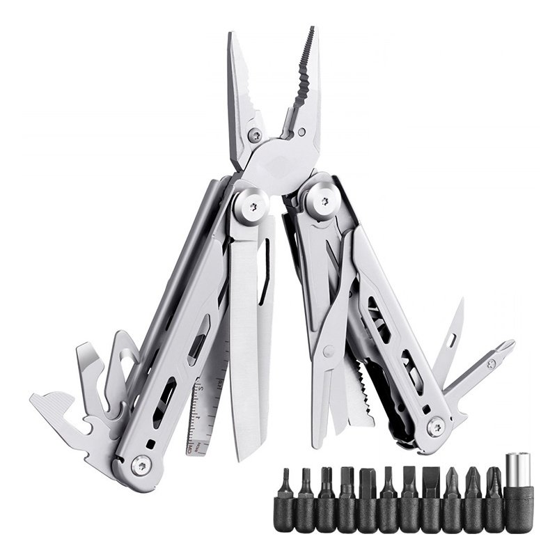 This multi tool combines various practical tools, including pliers, main blade, scissors, ruler, wood saw, slotted screwdrivers, etc.