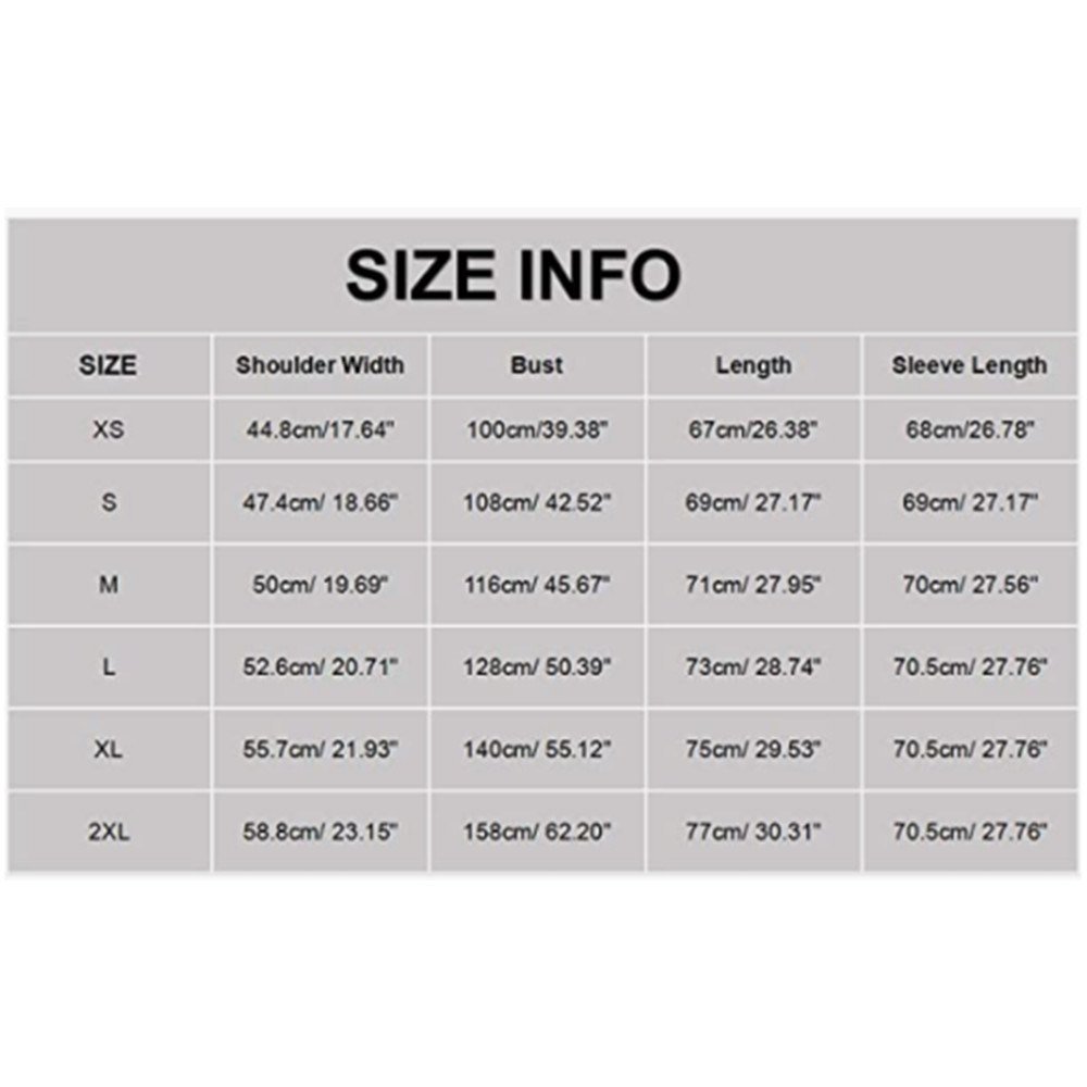 *Size:2XL-----Bust:158cm/62.20"-----Shoulder:58.8cm/23.15"-----Sleeve:70.5cm/27.76"-----Length:77cm/30.31"