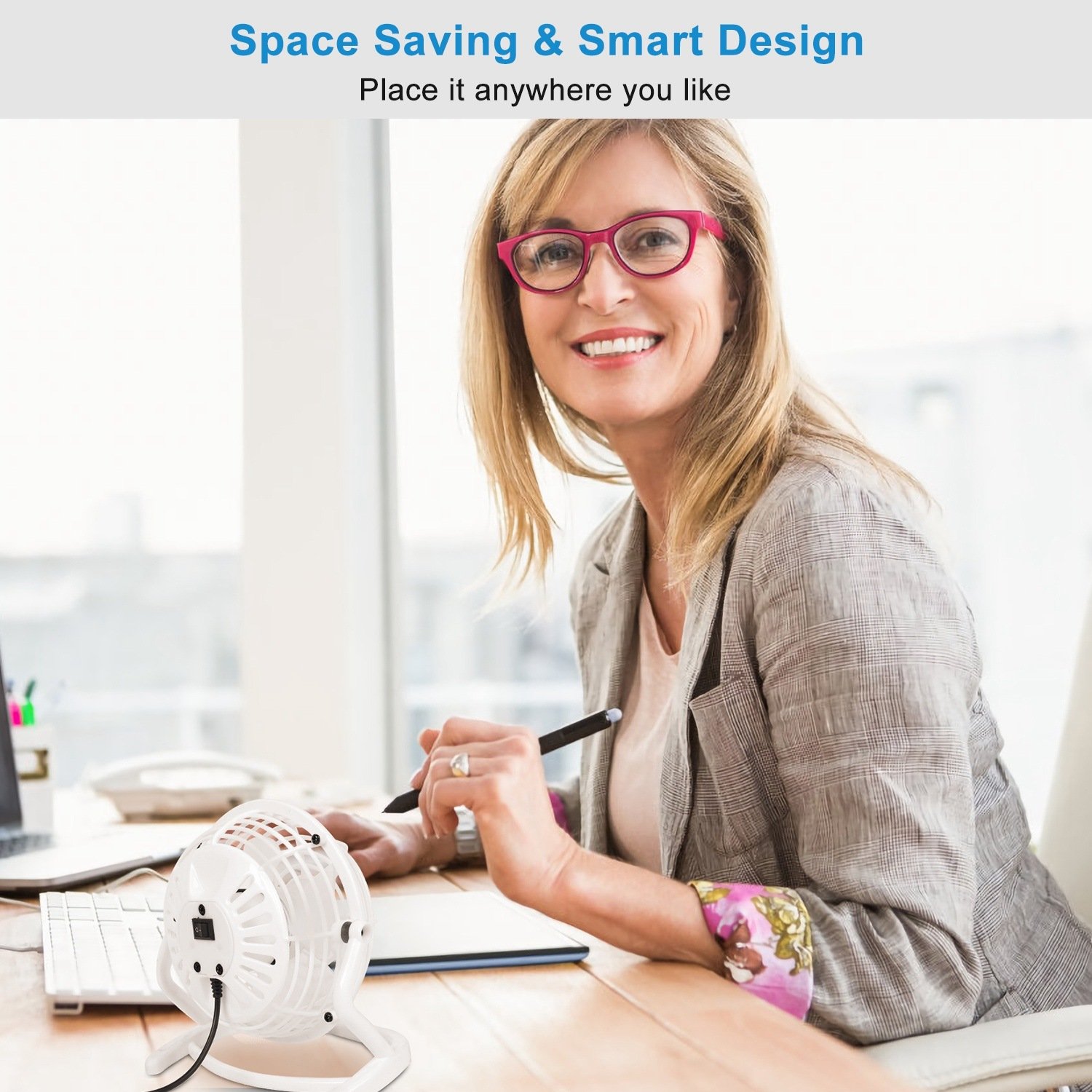 ** QUIET & EFFECTIVE: There are 4 blades made with a unique cutting process in our USB fans for desk. This revolutionary technology allows wind to flow more smoothly and fast. You will only hear a whispering sound when it is operating. Quiet operation makes it perfect to use while working or studying.