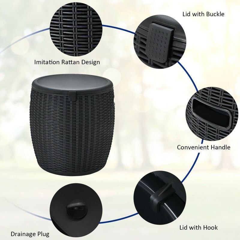 Multiple uses as a patio side table, an ice bucket, a stool and a storage box.