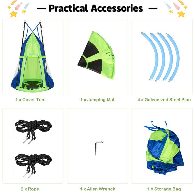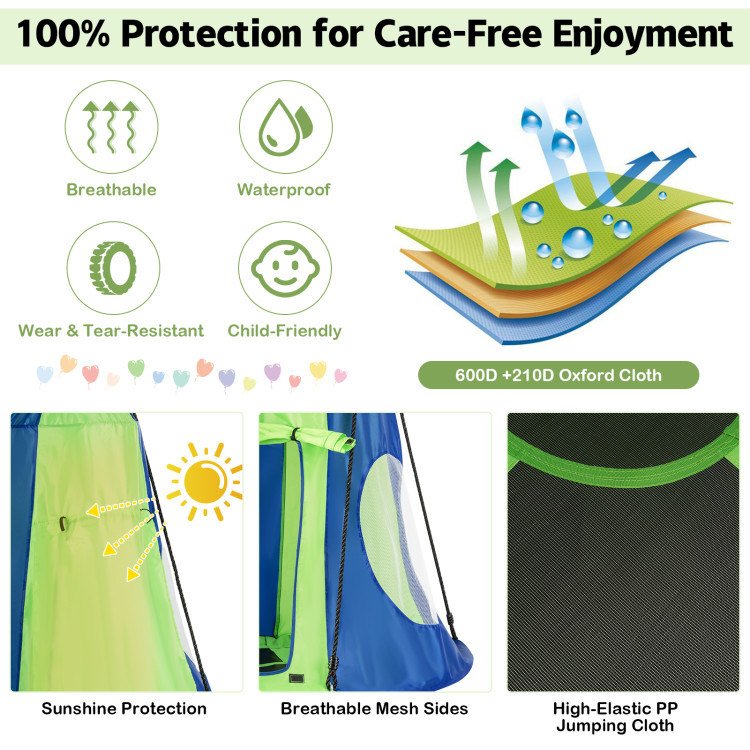 3.Safe and Comfortable Swing: Made of sturdy galvanized pipe with foam padding and heavy-duty PP jumping cloth and oxford fabric, this hanging swing tent has a strong load-bearing capacity of up to 330 lbs, available for kids to jump freely and safely. And the 360-degree tent enclosure design reassures its safety and gentle riding.