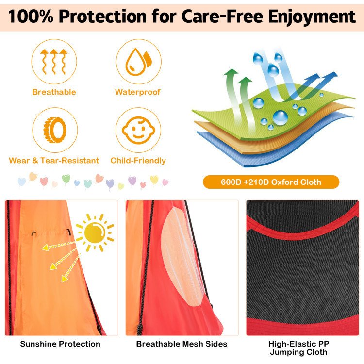3.Safe and Comfortable Swing: Made of sturdy galvanized pipe with foam padding and heavy-duty PP jumping cloth and oxford fabric, this hanging swing tent has a strong load-bearing capacity of up to 330 lbs, available for kids to jump freely and safely. And the 360-degree tent enclosure design reassures its safety and gentle riding.