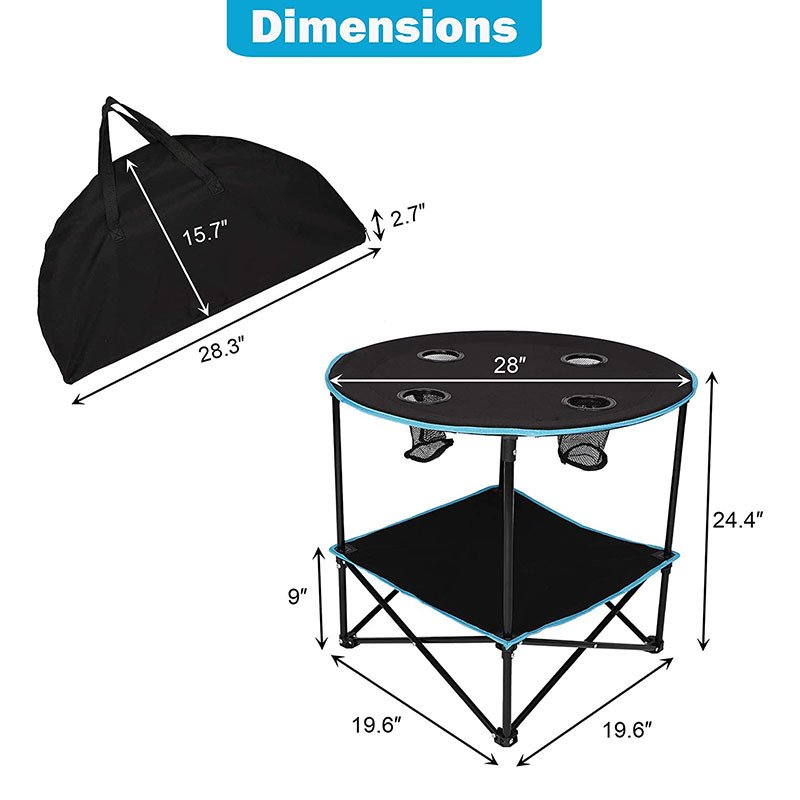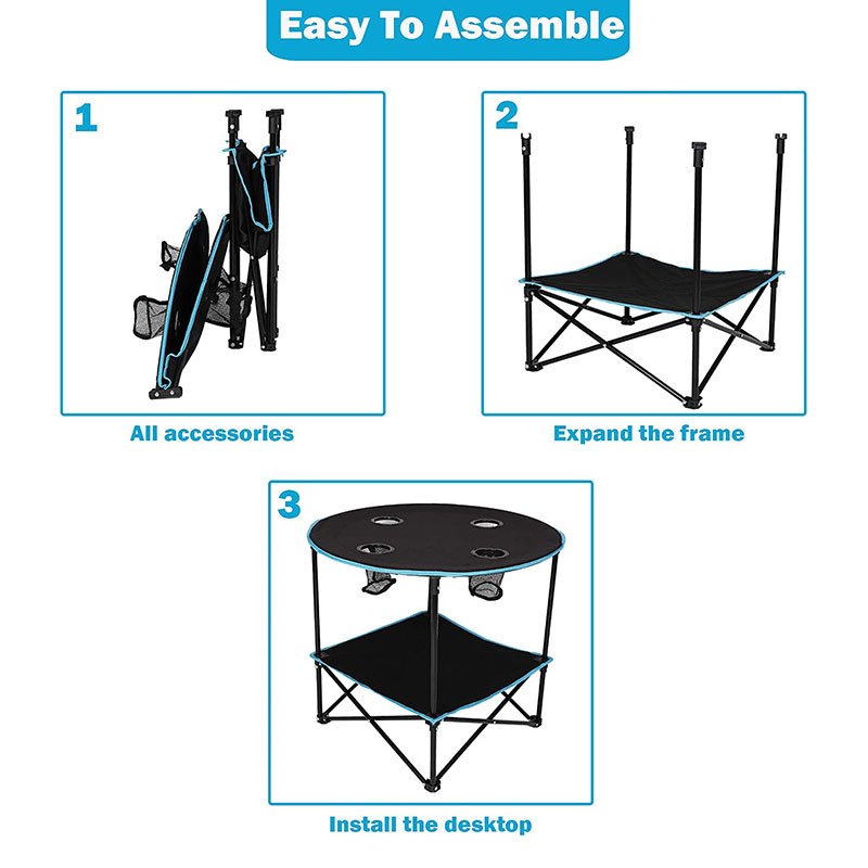 Material: 600D Oxford Fabric (Table Cloth), Steel (Frame), 210D Polyester Fabric (Carry Bag)