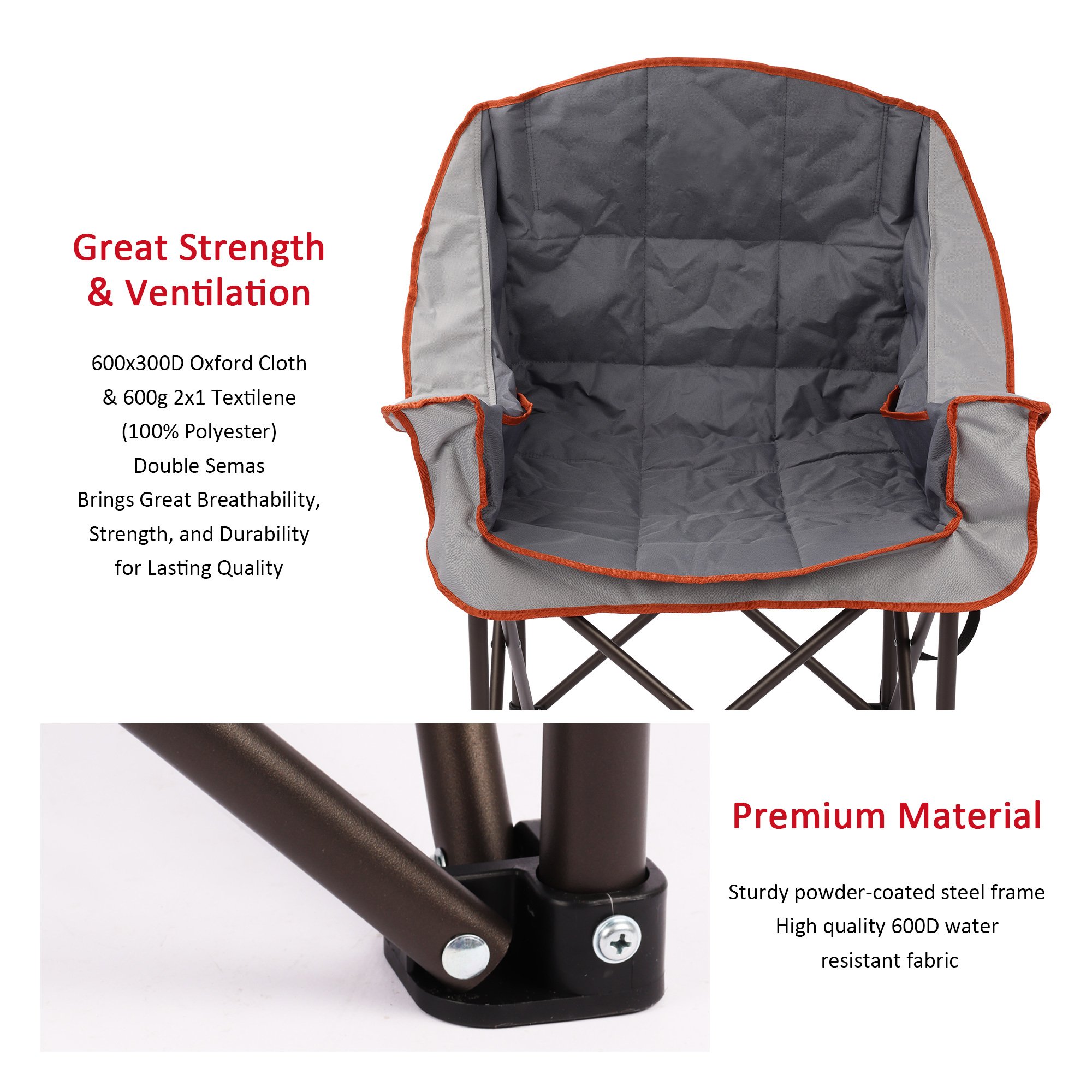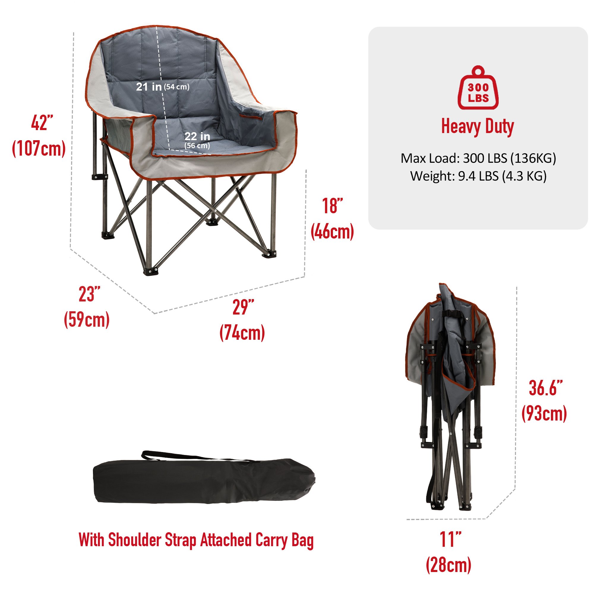 Super Handy: The attached cup holder frees your hands while camping, hiking, traveling or watching sporting events, and easily store your drinks, sunglasses, and phone within hands reach.Built to Last: The sturdy steel frame construction affords up to 300 LBS (136KG) weight capacity and the chair weights 9.4 LBS (4.3KG). The double-seam 600x300D Oxford Cloth and 3D Mesh with 560g Foam Padding has great strength, durability, and breathability. You don't have to worry for the heavy-duty use, either to buy a new one in the near future.